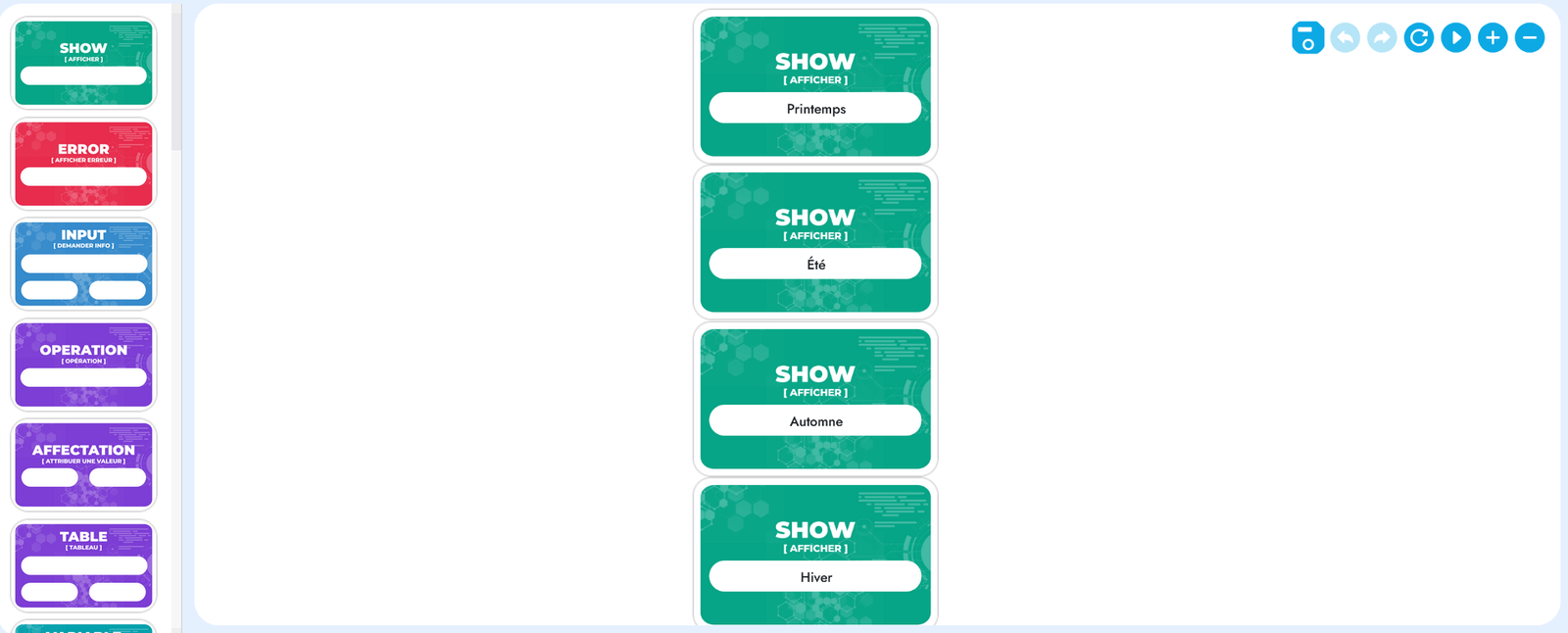 Dans cet exercice, tu vas apprendre à créer un programme qui affiche les quatre saisons, l’une après l’autre, en utilisant CodiCard.